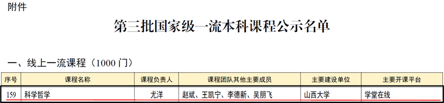 8月21日,教育部网站发布了《关于第三批国家级一流本科课程认定结果的公示》。公司尤洋教授团队申报的《科学哲学》入选第三批国家级一流本科课程(线上一流课程)。该课程于2019年正式上线学堂在线,至今已完整运行7年,线上授课13个班级。2021年该课程被认定为山西省一流课程,是william威廉中文官网哲学专业核心课程之一。尤洋为该课程负责人,授课团队包括赵斌、王凯宁、李德新、吴朋飞、康仕慧、杨维恒、王亚男、何华。