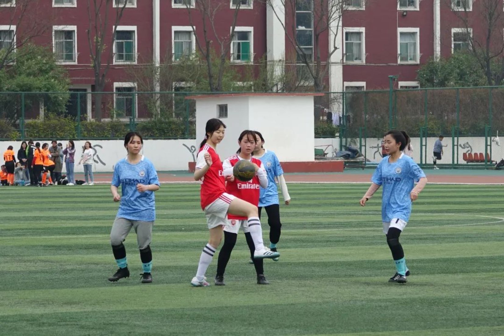 半节下来,赛场上打的激烈,场外教练也时刻及时指挥场上球员,周围同学也欢呼呐喊,为院女足鼓舞打气,阳光懒洋洋的洒下来,天气晴朗,一片安好。