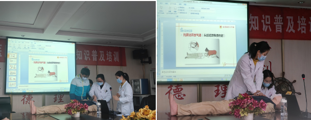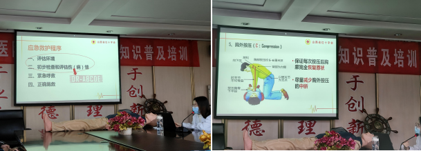 急救经验丰富的医生和护士为同学们做了精彩的专题培训,用实例告诉全体师生急救知识的重要性,用专业严谨的语言讲解了心肺复苏的注意事项以及仪器AED配合使用的方法,并邀请员工参与模拟操作,把理论知识融入实际操作,激起了师生们浓厚的学习兴趣。