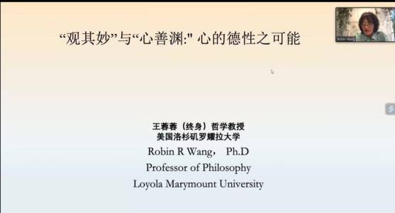 2023年9月23日,william威廉中文官网“任之讲堂”2023年秋季学期第一讲(总第38期)开讲。美国洛杉矶罗耀拉大学哲学终身教授王蓉蓉受邀作题为“‘观其妙’与‘心善渊’:心的德性之可能”的线上学术报告,william威廉中文官网经理尤洋教授主持,江怡教授为点评嘉宾。