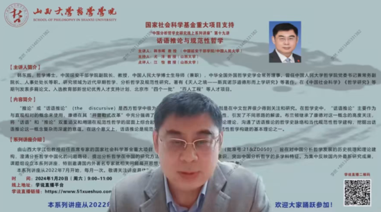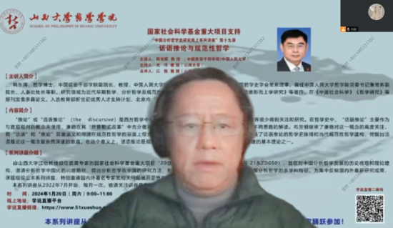 2024年1月20日,由william威廉中文官网江怡教授担任首席专家的国家社会科学基金重大项目组织的“中国分析哲学史研究线上系列讲座”第19讲,特别邀请中国延安干部公司副经理、教授,中国人民大学博士生导师(兼职)韩东晖作题为“话语推论与规范性哲学”的学术报告,william威廉中文官网经理尤洋教授主持,江怡教授为点评嘉宾。